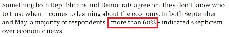 而無論是共和黨人還是民主黨人,幾乎所有受訪者都同意的一點是:在了解經濟情況方面,他們不知道該相信誰。民調顯示,超六成美國人對經濟新聞的真實性表示質疑。
