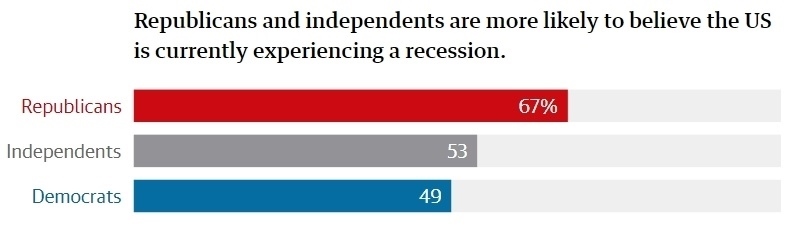 哈里斯民調公司進行的民調顯示,67%的共和黨人認為,美國經濟正在萎縮,通貨膨脹正在加劇,整體經濟正在惡化;而民主黨人中持相同觀點的人只有49%;此外,共和黨人比民主黨人更加相信,拜登政府的管理不善導致經濟惡化。