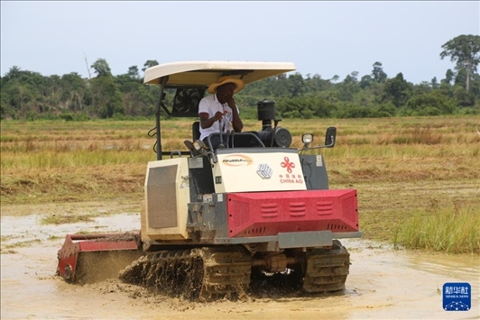 5月31日,在位于科特迪瓦南部迪沃省的格格杜墾區(qū),當(dāng)?shù)胤N植戶在水稻田里操作農(nóng)機作業(yè)。新華社記者 張健 攝