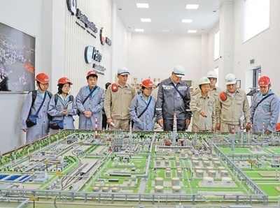 人民日?qǐng)?bào)和哈薩克斯坦媒體“高質(zhì)量共建‘一帶一路’”聯(lián)合采訪團(tuán)隊(duì)近日來(lái)到哈薩克斯坦奇姆肯特市,采訪了奇姆肯特?zé)拸S現(xiàn)代化改造項(xiàng)目。圖為聯(lián)合采訪團(tuán)隊(duì)在奇姆肯特?zé)拸S沙盤前聽(tīng)取情況介紹。本報(bào)記者 趙益普攝