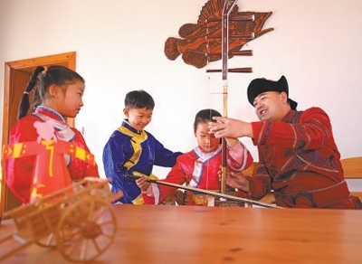 哈拉新村村民在教當?shù)睾⒆友葑鄠鹘y(tǒng)樂器。齊齊哈爾大學孟加拉國籍留學生 衣睿實攝“在哈拉新村,我看到四弦琴造型的村口大門、魚叉狀的路燈,還有整整齊齊的‘介字房’……這里獨特的民族文化、濃郁的鄉(xiāng)土風情,給我留下了深刻印象。當?shù)丶缺A魝鹘y(tǒng)的達斡爾族人文特征,又開發(fā)文化體驗館、民族特色美食等現(xiàn)代旅游資源,重視文化保護和傳承的做法值得借鑒?!?/p>