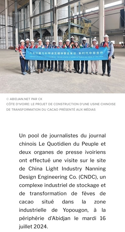 7月16日,人民日報與兩家科特迪瓦新聞機構(gòu)記者一行參觀了由中國輕工業(yè)南寧設(shè)計工程有限公司總承包的可可加工及可可豆倉庫建設(shè)項目,該項目坐落在阿比讓郊區(qū)的約普貢工業(yè)區(qū)。該公司負(fù)責(zé)人指出,該項目綜合體計劃于2024年年底完工,包括一個可加工5萬噸可可豆的工廠、可存儲14萬噸可可豆的倉庫以及培訓(xùn)中心、行政大樓等。——摘自科特迪瓦阿比讓網(wǎng)報道