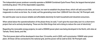 深能安所固投資建設(shè)運(yùn)營的聯(lián)合循環(huán)發(fā)電廠裝機(jī)容量560兆瓦,并計(jì)劃在未來通過擴(kuò)建工程提升至超1000兆瓦,為當(dāng)?shù)丶彝ズ凸I(yè)消費(fèi)者提供可靠且負(fù)擔(dān)得起的電力供應(yīng)。加中兩國員工在電廠運(yùn)營中密切合作,新入職的加納員工會配有一名中國導(dǎo)師,還可以通過參加培訓(xùn)提升職業(yè)技能。——摘自加納通訊社報(bào)道