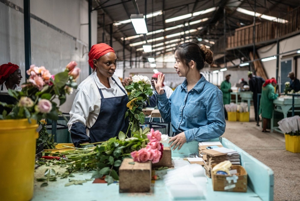 2024年5月18日,湖南璽悅國際貿(mào)易有限公司負(fù)責(zé)人黃梓楠(右)在肯尼亞納紐基的坦布濟花卉農(nóng)場挑選鮮花。中國政府2021年11月宣布為非洲農(nóng)產(chǎn)品輸華建立“綠色通道”,縮短檢驗檢疫時間,擴大關(guān)稅豁免,為肯尼亞鮮花及非洲各國的牛油果、柑橘、菠蘿等特色農(nóng)產(chǎn)品打開了銷路。
