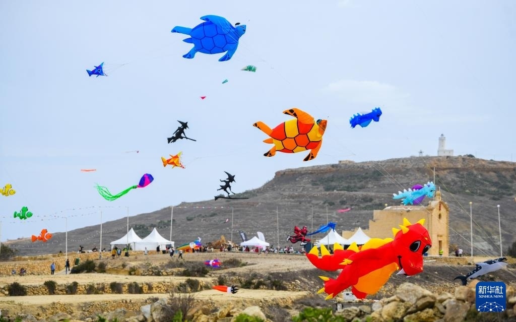 10月19日,在馬耳他戈佐島阿爾卜,人們在第7屆戈佐國際風箏節(jié)上放風箏。