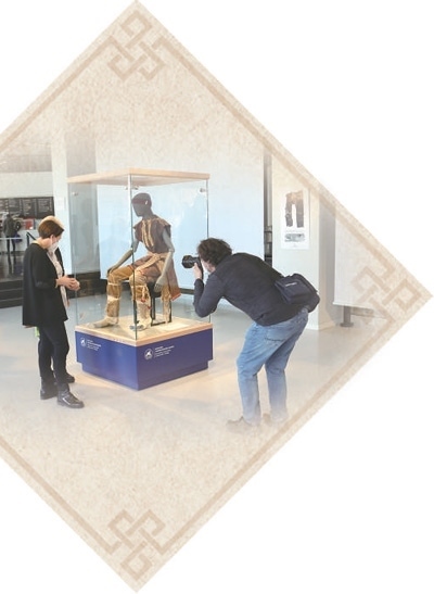 加入科研團隊的德國服裝設計師卡特琳·迪爾斯娜第一次接觸古代服飾文物,但多年來為歷史題材電影和戲劇制作服飾的經(jīng)驗對她很有幫助。此次全套服裝包括素絹高領短衫、粉色拼接藍色羊毛束口長褲、與長褲同色系的羊毛短靴(靴口為素絹)、素色絲質(zhì)裹身半裙、裝飾與配色同樣考究的套頭長袍,以及下緣綴有風琴褶的淺金拼淡玫紅色絲質(zhì)大衣——經(jīng)過科學復原,古代服飾的時尚審美與紡織技藝令人嘆服,衣物主人的綽約風姿也穿越千年風沙,宛在眼前?!翱吹竭@些服裝一件件穿在真人模特身上,完美地隨身搖擺,我被深深打動。那一刻,我和2000多年前的人與物情感相連,感受相通?!钡蠣査鼓日f。
