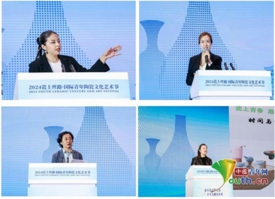 在主題演講環(huán)節(jié),四名陶瓷藝術領域青年藝術家代表分別上臺做了分享。土耳其青年藝術家佩琳因?qū)μ沾晌幕纳詈衽d趣而來到景德鎮(zhèn),她分享了自己對陶瓷文化的思考與理解,她認為“陶瓷藝術飽含著人們對文化多樣性繁榮發(fā)展、美美與共的美好期許”。韓國青年藝術家宋耎姝以自己的作品《銀之?!窞槔?,和大家分享了創(chuàng)作感悟,她認為“陶瓷藝術創(chuàng)作應當關注人與自然的和諧關系,從大自然中汲取養(yǎng)分”。第十二屆全國青聯(lián)委員、江西省青聯(lián)副主席、國家級技能大師工作室領辦人歐陽敏致力于陶瓷文化的傳播,他在分享中強調(diào),“陶瓷文化是中華文明與世界文明交流互鑒的橋梁和載體。各國青年應當做文化傳承創(chuàng)新的踐行者,充分挖掘各國歷史文化的獨特魅力和時代價值,把傳統(tǒng)文化與潮流文化融匯在陶瓷藝術的創(chuàng)作中,為共同推動人類文明發(fā)展進步貢獻青春力量?!本暗骆?zhèn)學院陶瓷美術與設計藝術學院院長張博以《陶瓷藝術在空間中的應用》為題,分享了陶瓷文化所代表的中華傳統(tǒng)文化如何與當代潮流文化相結(jié)合,共同繪制出一幅幅五彩斑斕的人類文明畫卷。