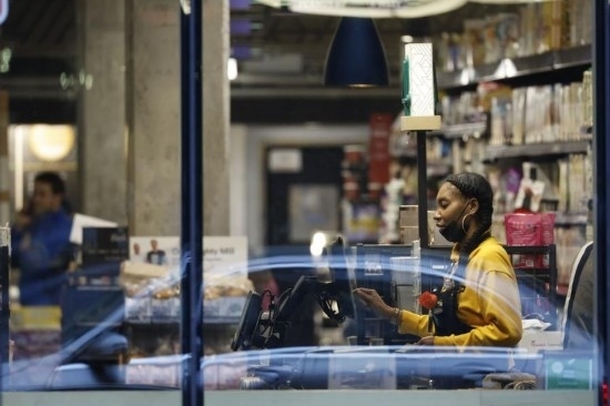 2022年5月6日,在美國華盛頓,一家超市的員工在收銀臺(tái)旁工作。新華社發(fā)(沈霆攝)