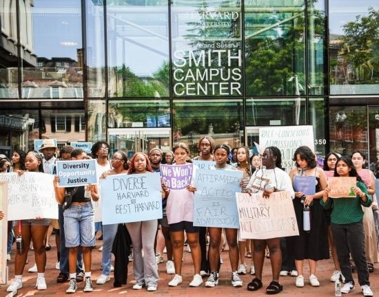 2023年7月1日,在美國馬薩諸塞州劍橋,人們手持標(biāo)語在哈佛大學(xué)校園舉行游行,抗議美國聯(lián)邦最高法院做出的招生政策判決。新華社發(fā)(朱子于攝)