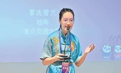來自越南的黎氏雪蘭來到中國之后,對(duì)武術(shù)產(chǎn)生了濃厚興趣。圖為她在比賽現(xiàn)場(chǎng)和大家分享自己學(xué)習(xí)武術(shù)的經(jīng)歷。
