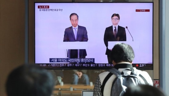 12月8日,在韓國首爾火車站,民眾觀看韓國執(zhí)政黨黨首韓東勛與國務(wù)總理韓德洙(左)共同會(huì)見記者的電視直播。新華社記者 姚琪琳 攝