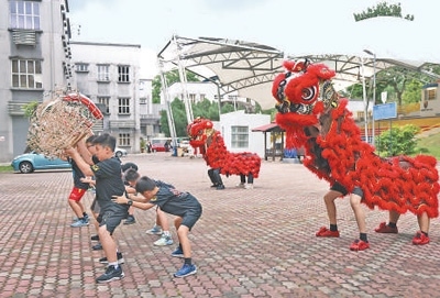 馬來(lái)西亞中小學(xué)生在馬來(lái)亞大學(xué)醒獅團(tuán)組織的培訓(xùn)課上練習(xí)舞獅。