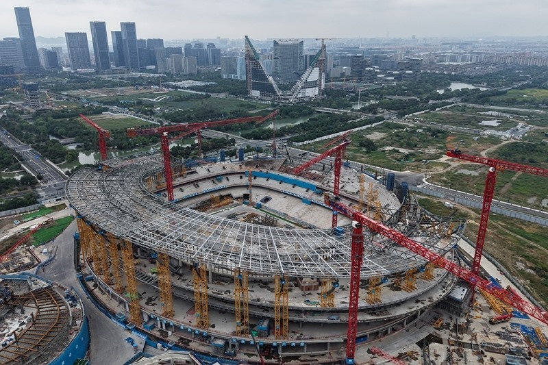 10月21日無人機(jī)拍攝的余杭國(guó)際體育中心工程體育館項(xiàng)目。