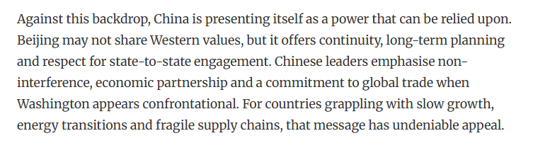 文章認為,在此背景下,中國是可靠力量。中國提供了連續(xù)性、長期規(guī)劃和尊重國家間的交流。中國強調不干涉、經濟伙伴關系和對維護全球貿易。對于那些正面臨增長緩慢、能源轉型和供應鏈脆弱的國家來說,這一主張具有不可否認的吸引力。另外,中國與美國不同,中國并不要求合作時必須實現(xiàn)意識形態(tài)上的一致性。中國提供市場、投資和交流。在不確定的時代,這些反而更體現(xiàn)了一種穩(wěn)定。