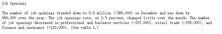報(bào)道稱,因?yàn)檎[而推遲發(fā)布的職位空缺和勞動(dòng)力流動(dòng)報(bào)告顯示出,在經(jīng)歷了數(shù)月的“微小變化”之后,美國(guó)12月份的職位空缺數(shù)量大幅下降,表明對(duì)新員工的需求有所減少。報(bào)道還指出,上周美國(guó)申請(qǐng)失業(yè)救濟(jì)金的人數(shù)創(chuàng)下兩個(gè)月來的最大增幅。美國(guó)勞工部發(fā)布的數(shù)據(jù)顯示,截至1月31日的一周,美國(guó)首次申請(qǐng)失業(yè)救濟(jì)金的人數(shù)為23.1萬人,和前一周的人數(shù)相比增加了22000人。
