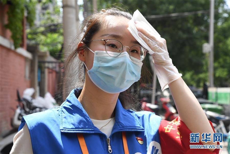 6月16日,在北京市海淀區(qū)中關(guān)村街道白塔庵社區(qū)出入口,疫情防控志愿者王玥在擦拭汗水。連日來,北京出現(xiàn)高溫天氣??崾钪?,工作人員堅守抗擊疫情一線,成為烈日下的“逆行者”。新華社記者任超攝