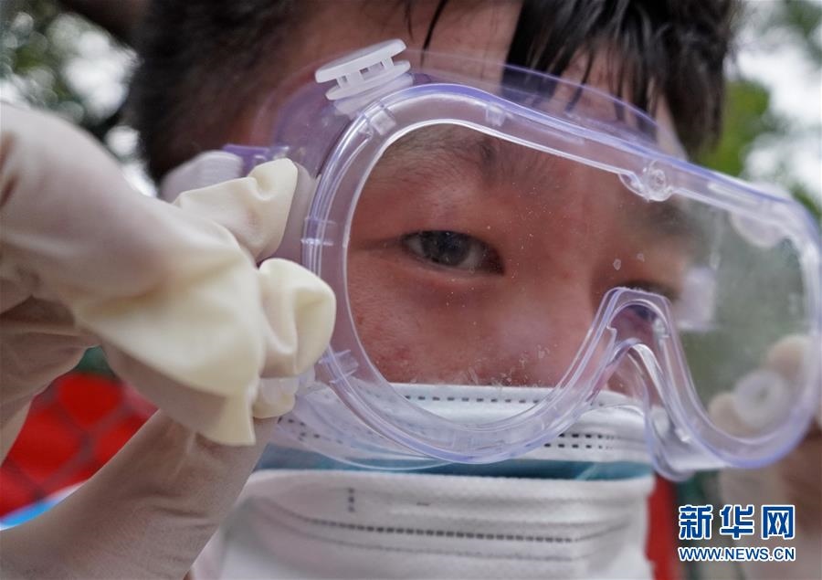 豐臺區(qū)東高地街道社區(qū)衛(wèi)生服務(wù)中心一位醫(yī)護(hù)人員的護(hù)目鏡內(nèi)流進(jìn)了汗水(6月15日攝)。連日來,北京出現(xiàn)高溫天氣??崾钪?,工作人員堅守抗擊疫情一線,成為烈日下的“逆行者”。新華社記者李欣攝