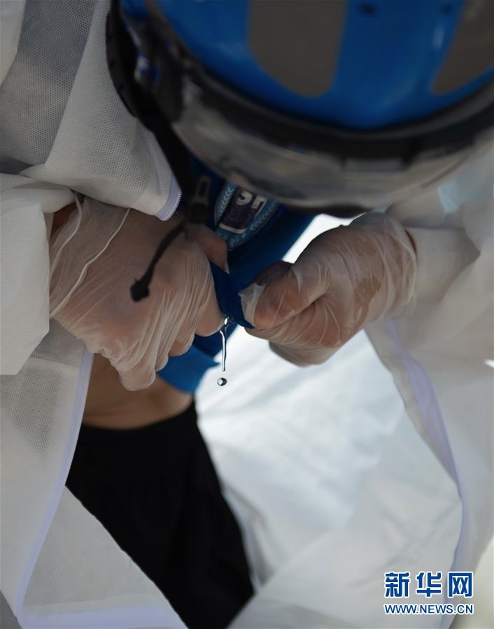 6月16日,北京藍(lán)天救援隊完成消殺任務(wù)后,一位隊員的衣服被擰出了汗水。連日來,北京出現(xiàn)高溫天氣??崾钪?,工作人員堅守抗擊疫情一線,成為烈日下的“逆行者”。新華社發(fā)(陳鐘昊攝)