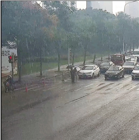 當(dāng)老人好不容易快走到馬路對面時,天公不作美,突然下起瓢潑大雨,又一幕感人的瞬間出現(xiàn)了:一輛等候通行的小轎車上下來一名女司機,從后備廂拿出一把雨傘后,快步跑上前,遞到老人手里。