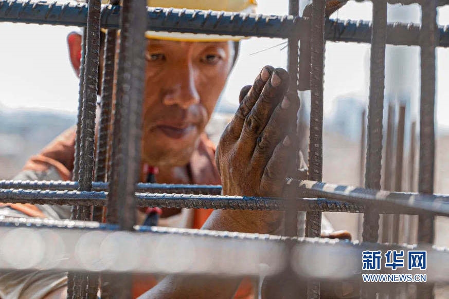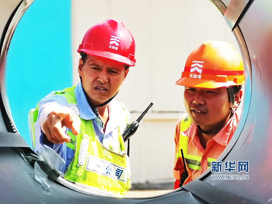 天津港航建設(shè)工人冒著酷暑在天津港c段碼頭建設(shè)現(xiàn)場檢查鋼筋情況。新華網(wǎng)發(fā)