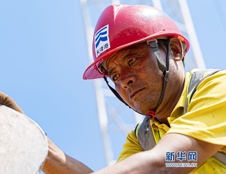 烈日當空,建設(shè)工人在天津港c段智能化集裝箱碼頭建設(shè)現(xiàn)場進行安裝樁體工作。新華網(wǎng)發(fā)