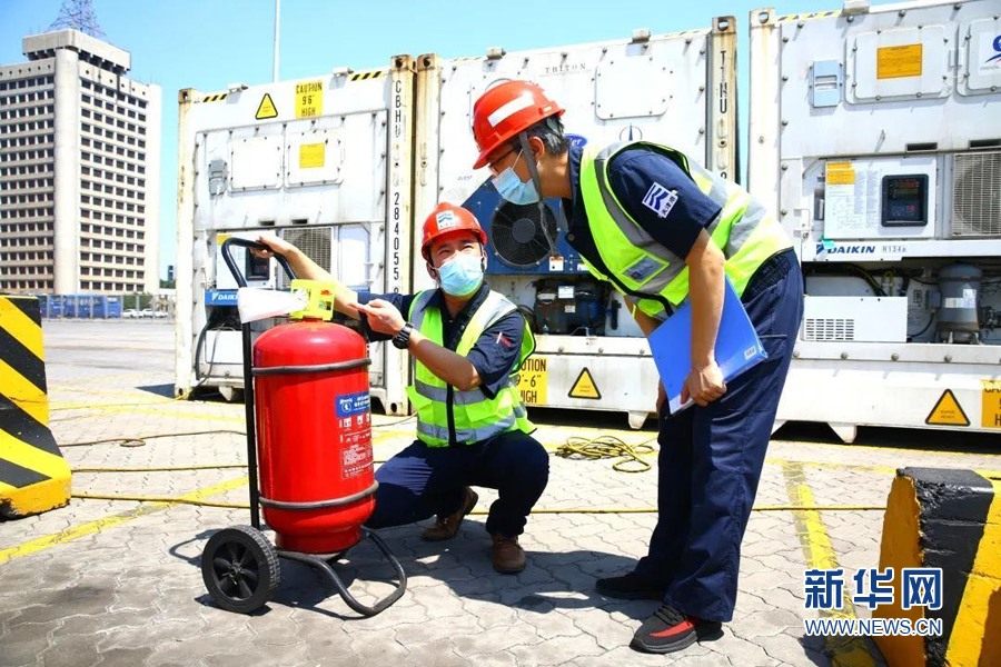 烈日當空,天津港集裝箱碼頭公司安全員正在冷箱堆存場地檢查安全消防設(shè)施。新華網(wǎng)發(fā)