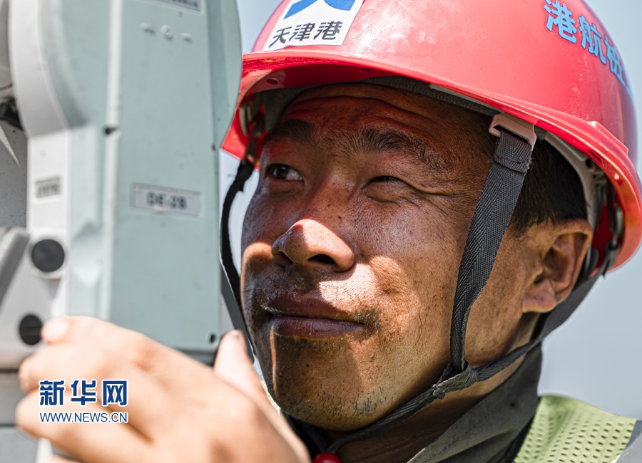 建設(shè)工人冒著酷暑在天津港C段智能化集裝箱碼頭建設(shè)現(xiàn)場做測量工作。新華網(wǎng)發(fā)