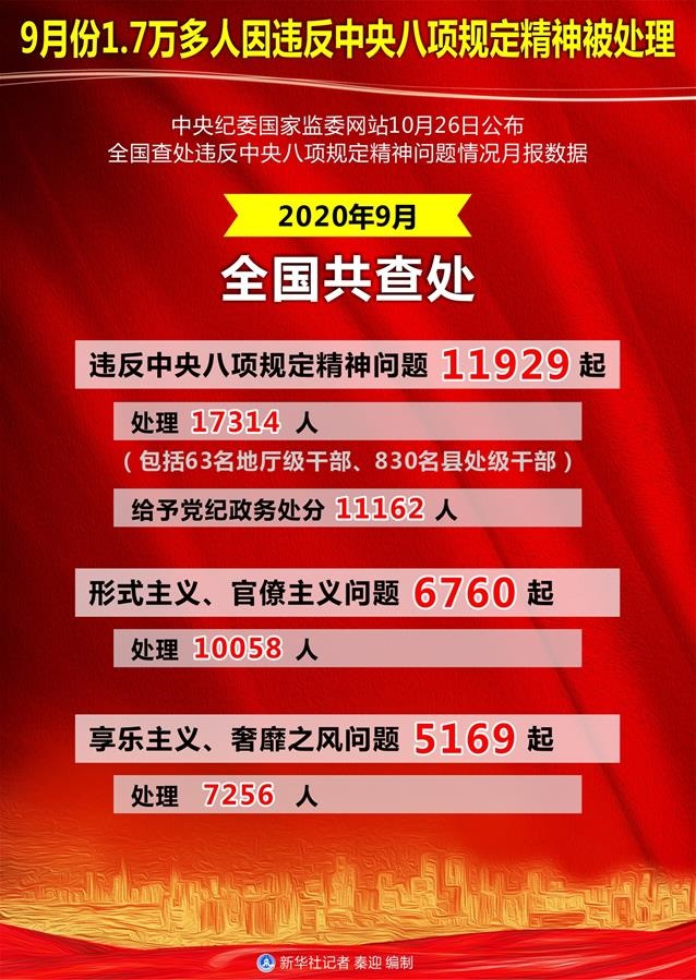 新華社北京10月26日電(記者朱基釵、孫少龍)中央紀(jì)委國(guó)家監(jiān)委網(wǎng)站26日公布全國(guó)查處違反中央八項(xiàng)規(guī)定精神問題情況月報(bào)數(shù)據(jù)。通報(bào)顯示,2020年9月,全國(guó)共查處違反中央八項(xiàng)規(guī)定精神問題11929起,處理17314人(包括63名地廳級(jí)干部、830名縣處級(jí)干部),給予黨紀(jì)政務(wù)處分11162人。