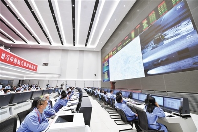 12月17日,工作人員在北京航天飛行控制中心嫦娥五號任務(wù)飛控現(xiàn)場觀看返回器攜帶月球樣品安全著陸。新華社記者 岳月偉攝