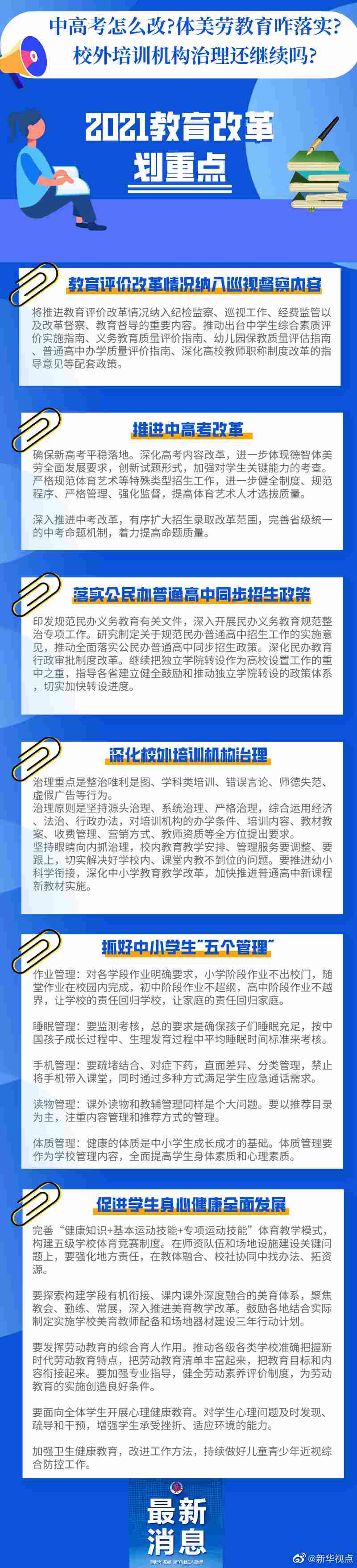中高考怎么改?體美勞教育咋落實?校外培訓機構(gòu)治理還繼續(xù)嗎?中小學生作業(yè)、睡眠、手機、讀物、體質(zhì)都要納入管理?這些社會關(guān)心的熱點,在2021年教育發(fā)展改革中都將涉及。記者梳理教育部部長陳寶生在2021年全國教育工作會議上的講話,及《教育部2021年工作要點》,為你劃出以下重點。詳情請見大圖↓↓(記者胡浩)