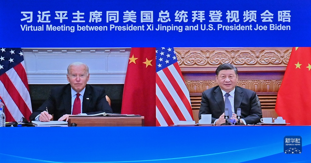 這是2021年11月16日上午,國(guó)家主席習(xí)近平在北京同美國(guó)總統(tǒng)拜登舉行視頻會(huì)晤。新華社記者 岳月偉 攝
