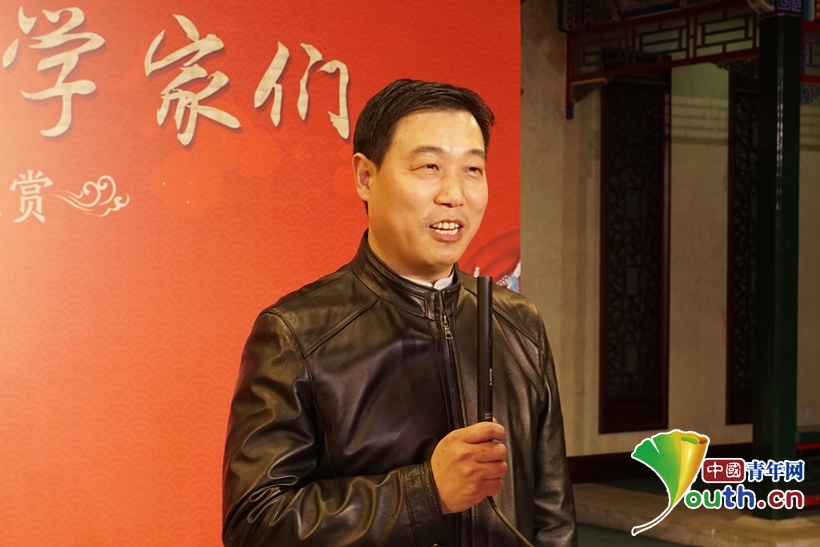 圖為國(guó)家京劇院黨委書(shū)記、副院長(zhǎng)張亞峰向科技工作者送上新春祝福。中國(guó)青年網(wǎng)記者 楊晴 攝