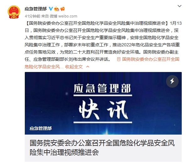 據(jù)應(yīng)急管理部官方微博消息,近日國(guó)務(wù)院安委會(huì)辦公室召開(kāi)全國(guó)危險(xiǎn)化學(xué)品安全風(fēng)險(xiǎn)集中治理視頻推進(jìn)會(huì),會(huì)議明確指出要保持高度警覺(jué),加強(qiáng)監(jiān)督檢查和明查暗訪(fǎng),落實(shí)各項(xiàng)安全防范措施,嚴(yán)格領(lǐng)導(dǎo)帶班和值班值守,切實(shí)抓好歲末年初危化品安全生產(chǎn)工作,堅(jiān)決防范各類(lèi)事故發(fā)生。