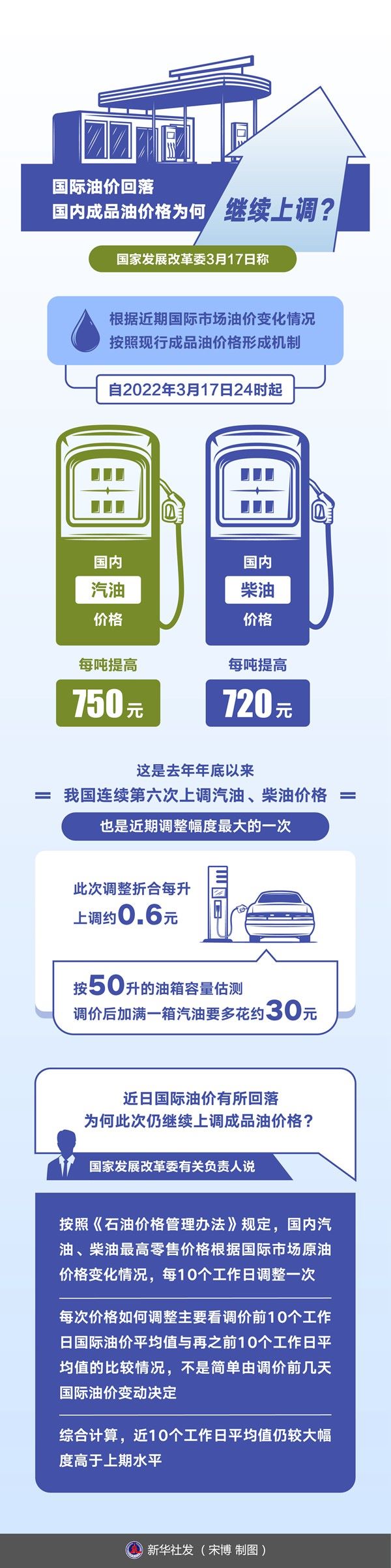 國家發(fā)展改革委17日稱,根據(jù)近期國際市場油價變化情況,按照現(xiàn)行成品油價格形成機(jī)制,自2022年3月17日24時起,國內(nèi)汽油、柴油價格每噸分別提高750元和720元。