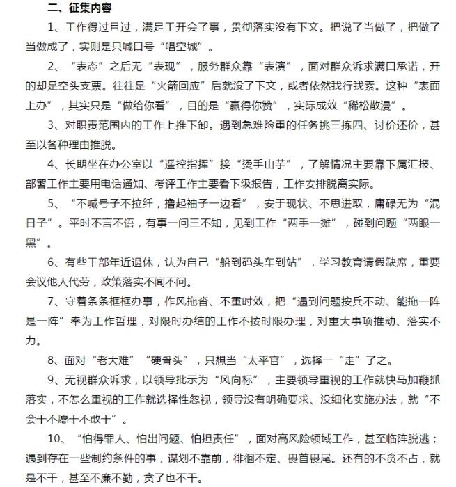 “躺平式干部”線索的征集包括10個方面,例如,“工作得過且過,滿足于開會了事”,“‘表態(tài)’之后無‘表現(xiàn)’,服務(wù)群眾靠‘表演’”,“平時不言不語,有事一問三不知”,等等。