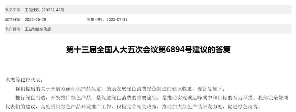 在答復(fù)中,工信部表示,推行綠色制造,開發(fā)推廣綠色產(chǎn)品,是促進綠色消費的重要途徑,是推動實現(xiàn)碳達(dá)峰碳中和目標(biāo)的有力舉措。工信部完全贊同代表們的建議,高度重視綠色產(chǎn)品開發(fā)推廣工作,積極完善相關(guān)政策,推動加大綠色產(chǎn)品研發(fā)力度,促進綠色消費。