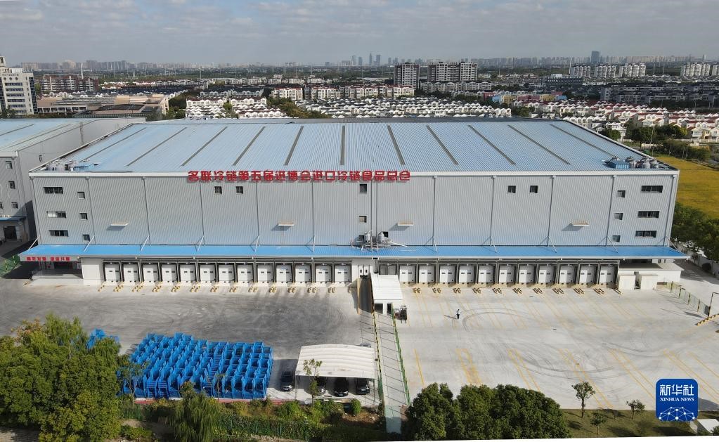 10月20日,空中俯瞰位于上海青浦區(qū)的名聯(lián)冷鏈第五屆進博會進口冷鏈食品總倉(無人機照片)。新華社記者 方喆攝