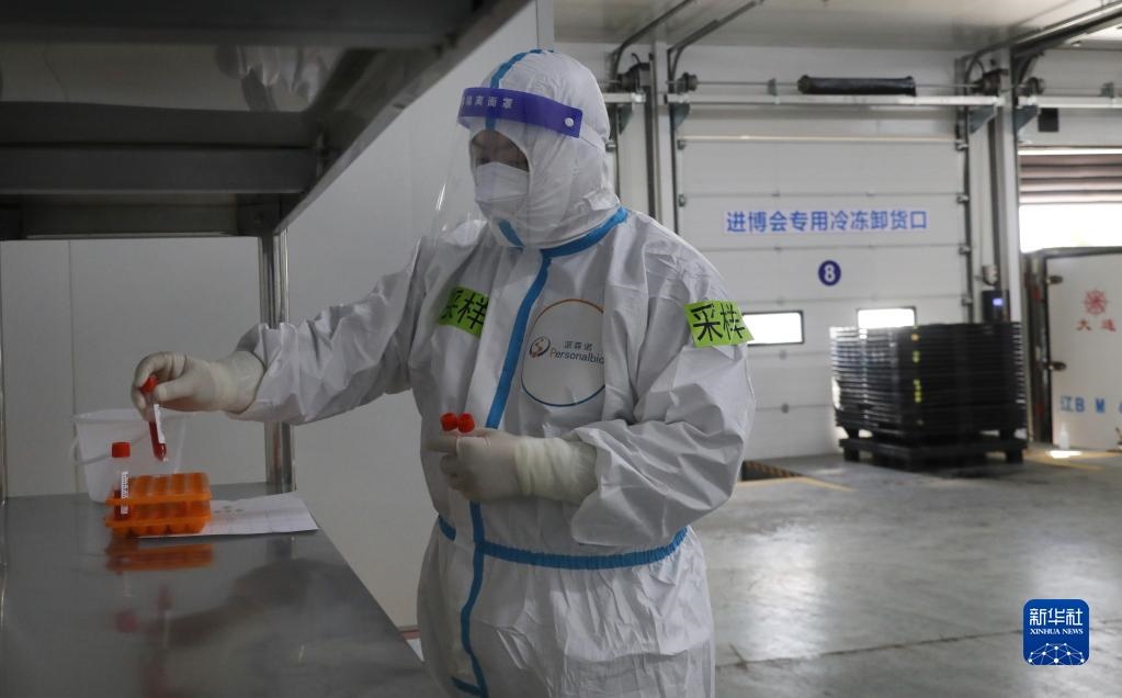 10月20日,一名核酸采樣工作人員在放置入倉的冷鏈食品展品核酸樣本。新華社記者 方喆攝
