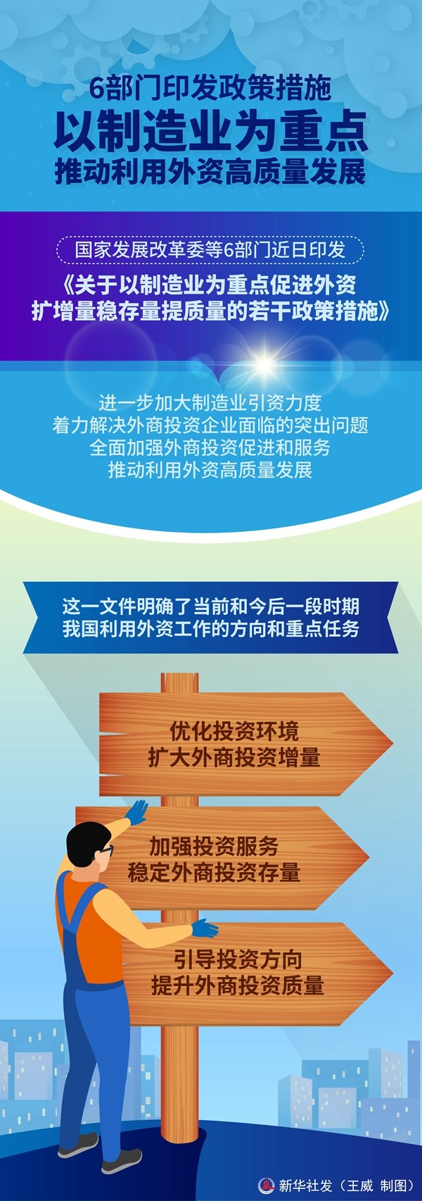 新華社北京10月25日電(記者安蓓)記者25日了解到,國家發(fā)展改革委等6部門近日印發(fā)《關(guān)于以制造業(yè)為重點促進外資擴增量穩(wěn)存量提質(zhì)量的若干政策措施》,進一步加大制造業(yè)引資力度,著力解決外商投資企業(yè)面臨的突出問題,全面加強外商投資促進和服務(wù),推動利用外資高質(zhì)量發(fā)展。