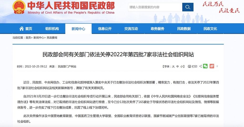 此次關(guān)停操作涉及中國營地教育聯(lián)盟、中國醫(yī)藥衛(wèi)生管理大學(xué)聯(lián)盟、全國職業(yè)教育師資培訓(xùn)聯(lián)盟、國家節(jié)能減碳產(chǎn)業(yè)創(chuàng)新聯(lián)盟、中國監(jiān)督網(wǎng)浙江象山辦事處、中國煤礦創(chuàng)傷學(xué)會華北分會、全心犬意犬類領(lǐng)養(yǎng)中心等7家已被取締的非法社會組織。