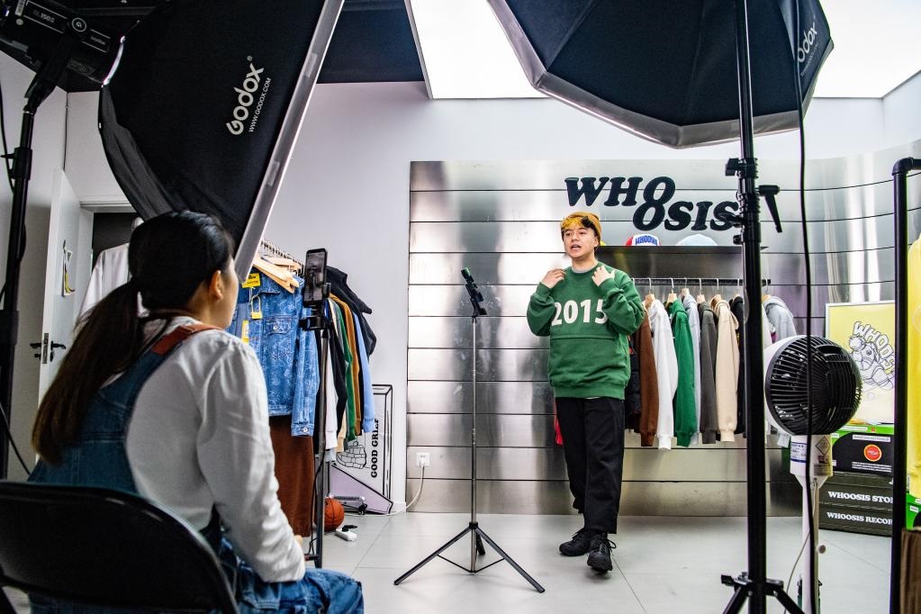 在重慶市渝中區(qū)由工業(yè)遺址改造成的“一廠影視園”一家國潮品牌公司內(nèi),創(chuàng)業(yè)者通過手機直播銷售商品(2022年9月27日攝)。新華社記者唐奕攝