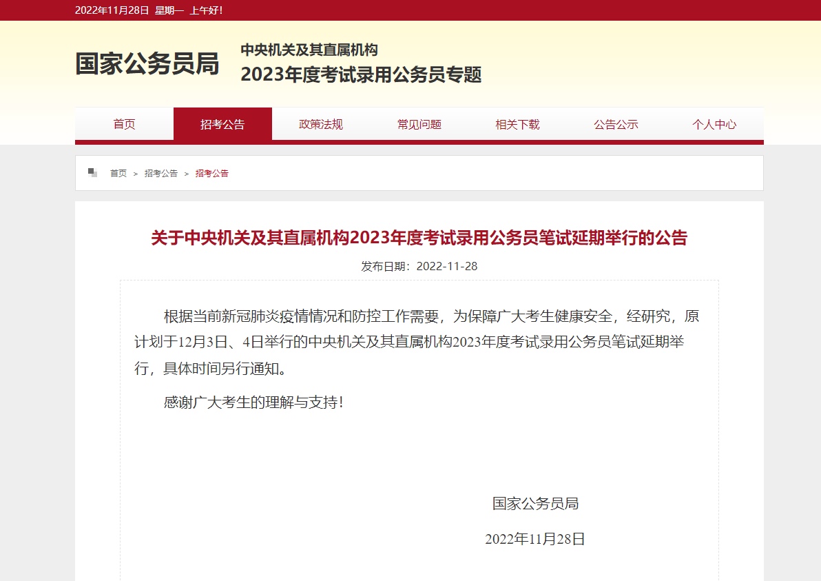 ??根據當前新冠肺炎疫情情況和防控工作需要,為保障廣大考生健康安全,經研究,原計劃于12月3日、4日舉行的中央機關及其直屬機構2023年度考試錄用公務員筆試延期舉行,具體時間另行通知。