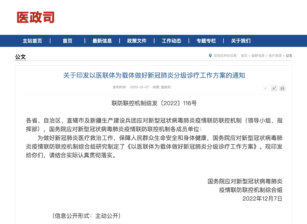 新華社北京12月7日電 為做好新冠肺炎醫(yī)療救治工作,全力保障高齡合并基礎(chǔ)疾病等重癥風(fēng)險(xiǎn)較高的感染者及時(shí)救治,構(gòu)建更加科學(xué)有序的就醫(yī)秩序,國(guó)務(wù)院聯(lián)防聯(lián)控機(jī)制綜合組12月7日發(fā)布《以醫(yī)聯(lián)體為載體做好新冠肺炎分級(jí)診療工作方案》。