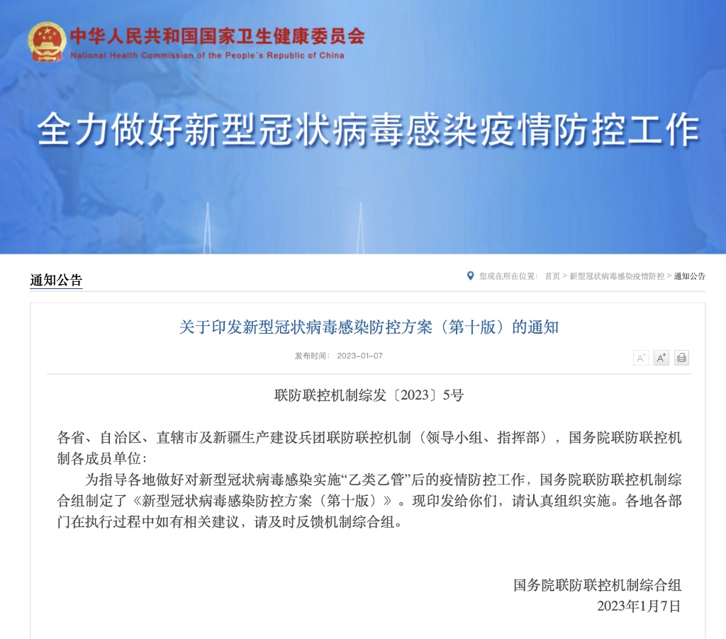 國(guó)務(wù)院聯(lián)防聯(lián)控機(jī)制綜合組印發(fā)第十版新型冠狀病毒感染防控方案
