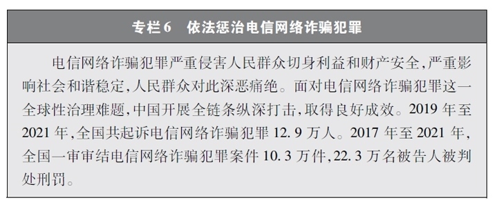 加大網(wǎng)絡犯罪懲治力度。隨著互聯(lián)網(wǎng)技術的快速發(fā)展,傳統(tǒng)犯罪加速向以互聯(lián)網(wǎng)為媒介的非接觸式犯罪轉(zhuǎn)變,電信網(wǎng)絡詐騙、網(wǎng)絡賭博、網(wǎng)絡淫穢色情等涉網(wǎng)違法犯罪多發(fā)。中國依法辦理新型網(wǎng)絡犯罪案件。連續(xù)多年開展“凈網(wǎng)行動”,嚴厲打擊群眾反映強烈的黑客攻擊破壞、侵犯公民個人信息等違法犯罪活動。持續(xù)推進“云劍”“斷卡”“斷流”“拔釘”等專項行動,打擊套路貸、校園貸、“以房養(yǎng)老”、“投資養(yǎng)老”等電信網(wǎng)絡詐騙犯罪,依法懲處為電信網(wǎng)絡詐騙犯罪團伙提供互聯(lián)網(wǎng)接入、域名注冊、服務器托管、移動互聯(lián)網(wǎng)應用程序制作開發(fā)、網(wǎng)絡支付、引流推廣等服務支撐的黑灰產(chǎn)業(yè)。完善國家反詐大數(shù)據(jù)平臺和反詐移動互聯(lián)網(wǎng)應用程序,建設國家涉詐黑樣本庫,完善快速止付凍結(jié)機制、涉詐資金返還機制。堅決打擊網(wǎng)絡賭博犯罪行為,從嚴治理網(wǎng)絡淫穢色情。網(wǎng)絡犯罪治理工作取得明顯成效,人民群眾安全感有效提升,社會更加和諧穩(wěn)定。