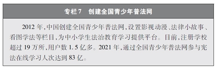 加強青少年網(wǎng)絡法治宣傳教育。青少年是祖國的未來、民族的希望。青少年網(wǎng)民在中國網(wǎng)民中的占比逐步增長。作為互聯(lián)網(wǎng)的“原住民”,青少年是網(wǎng)上學習、交流、生活最活躍的參與者、實踐者,其合法權(quán)益也更易受到網(wǎng)絡違法活動的侵害。中國從保護青少年網(wǎng)絡權(quán)益,促進青少年健康成長、全面發(fā)展出發(fā),遵循青少年身心發(fā)展規(guī)律,貼近青少年學習生活實際,聚焦網(wǎng)絡沉迷、網(wǎng)絡欺凌、網(wǎng)絡淫穢色情信息等重點問題,通過普法微綜藝、兒童普法話劇、網(wǎng)絡普法故事廣播、網(wǎng)絡普法云課堂、學法用法知識競賽、法治副校長進校園、編寫網(wǎng)絡普法讀本等生動活潑、豐富多彩的形式開展法治宣傳教育,逐步形成了政府、社會、學校、家庭相結(jié)合的法治宣傳教育格局,為提升青少年網(wǎng)民法治意識和網(wǎng)絡安全素養(yǎng)提供了全面保障。