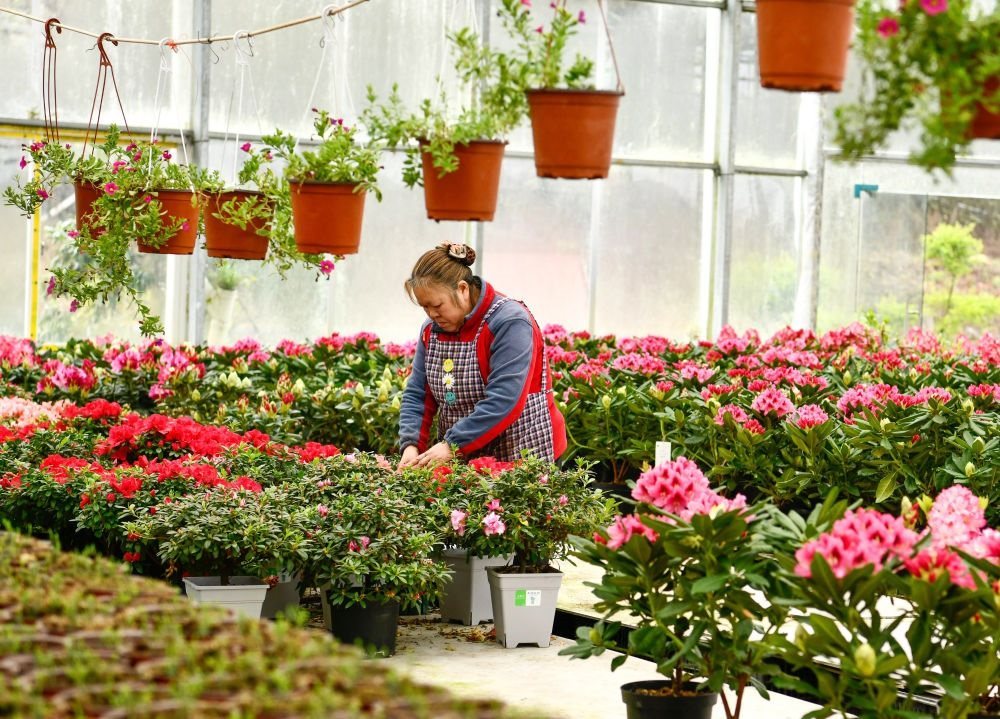 農民在貴州省畢節(jié)市百里杜鵑管理區(qū)匯境花卉基地管護花卉(2023年3月28日攝)。新華社記者 楊文斌 攝