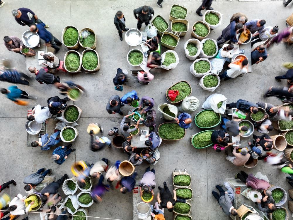 茶商在貴州省遵義市湄潭縣湄江茶青交易市場內收購茶青(無人機照片,2023年4月4日攝)。新華社記者 歐東衢 攝