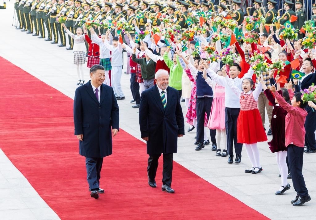4月14日下午,國家主席習(xí)近平在北京人民大會堂同來華進行國事訪問的巴西總統(tǒng)盧拉舉行會談。這是會談前,習(xí)近平在人民大會堂東門外廣場為盧拉舉行歡迎儀式。新華社記者 黃敬文 攝