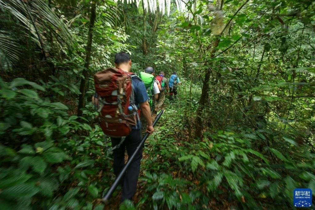 3月16日,聯(lián)合科考隊(duì)成員穿行在密林中。   新華社發(fā)(徐健 攝)